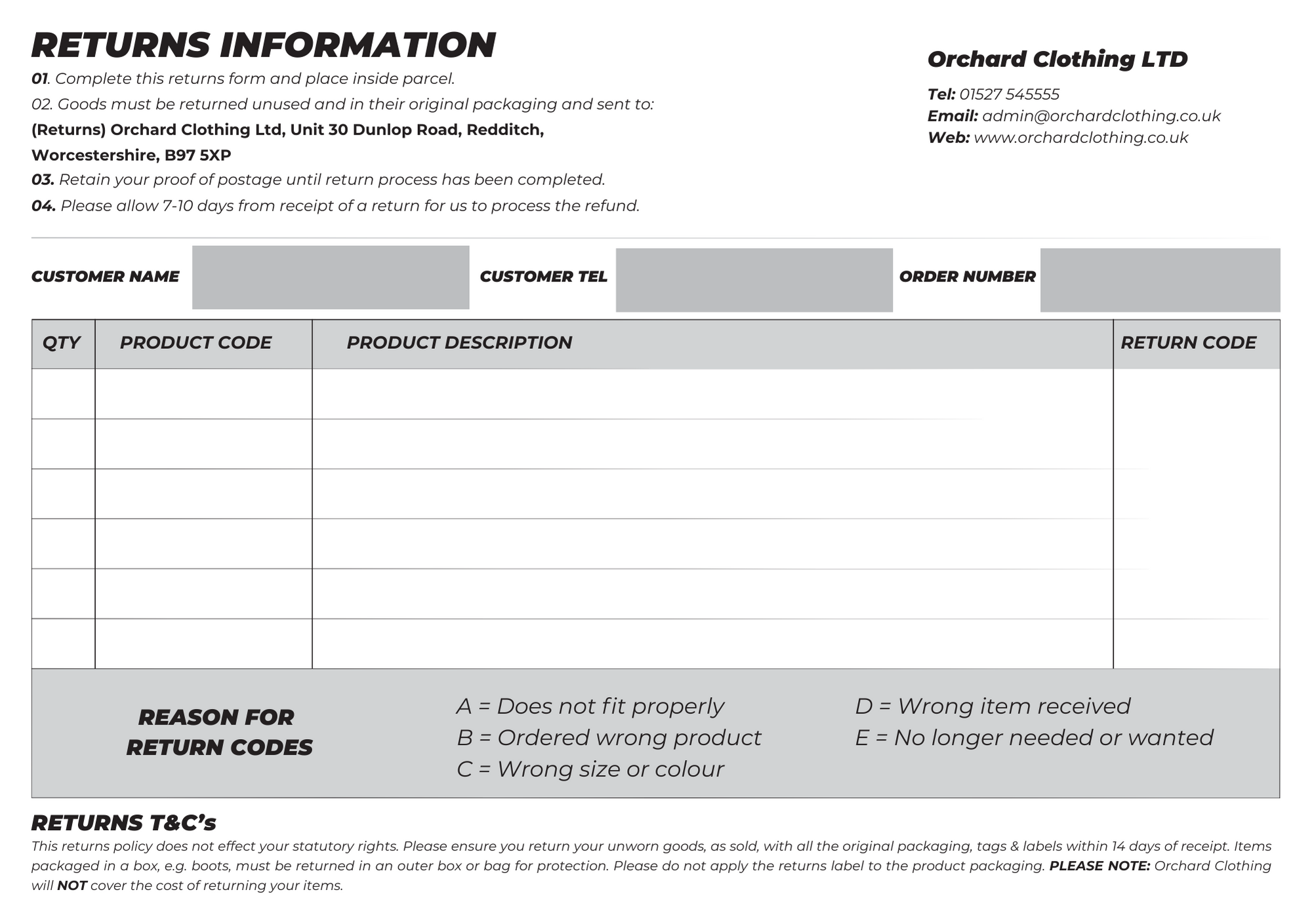4. Send your return to: (Returns) Orchard Clothing Ltd, Unit 30 Dunlop Road, Redditch, Worcestershire, B97 5XP. We recommend sending your return via Royal Mail 2nd Class Signed For delivery. We cannot be held responsible for any goods that do not reach us without a proof receipt for the recorded or signed for delivery.